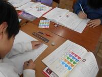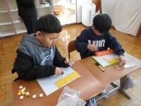 お隣さんとジャンケンをして、パーで勝ったら3個、チョキで勝ったら2個、グーで勝ったら1個のブロックを取ります。お互いのブロックがどんどんたまっていきます。たくさんのブロックをどのように数えれば早く正確に数えられるでしょうか。まとまりをつくることまでは思いついたようですが、どのようなまとまりにすれば良いでしょうか。