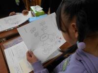 統合する西小学校の同級生に、加蘇地区の良さとして伝えたいことを考えます。まずは図を使って自分の考えを整理しました。次に友達同士で図を見合って、分かりやすいと思った表現に「イイネ」シールを貼り合ったり、もっと分かりやすくできると思ったことをアドバイスし合ったりしました。伝えたいことを決めることができたでしょうか。