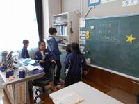 Christmas is coming soon. The ALT comes to class dressed like a Christmas tree. 1st grade and 2nd grade students learned English words for shapes. they look for squares and circles and the other shapes in the classroom. When they find them, they tell each other in English. Learning while moving their bodies helps them enjoy learning and remember better.