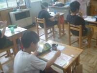 自分で育てているアサガオや野菜の観察です・・・が、朝からの雨のため外での活動ができません。今まで撮りためてきた写真を比べながら、何がどのように変わったか見つける活動をしていました。観察活動では「よく見る」ことが大切ですが、では「よく見る」とは何をすればいいんでしょう。子ども達からは「じっと見る」「しずかに見る」「しゅうちゅうして見る」が挙げられたようです。先生からは「色を見る」「形を見る」「大きさを見る」などのアドバイスがありました。