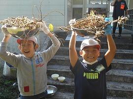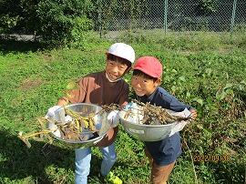 農園で育ててきたサトイモを収穫しました。大収穫で1・2年生も大喜びでした。お手伝いいただいたボランティアの皆様、ありがとうございました。