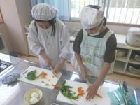 5・6年生家庭科の調理実習で野菜炒めを作りました。栄養士の先生もアシスタントで参加です。経験者の6年生が5年生に包丁の使い方やガスコンロの火のつけ方などを「得意気に」教えています。5年生と6年生が知恵を出し合いながら学び合うことができるのは、複式学級のよさの一つだと思います。完成した野菜炒めのお裾分けをいただきました。ニンジンの葉がアクセントになっていて、大変おいしゅうございました。