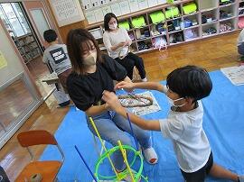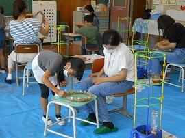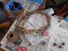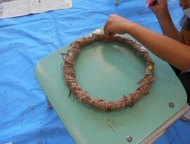親子であさがおのつるのリース作りを行いました。あさがおのつるを鉢植えの支柱から外すのが大変な作業でしたが、家の人と協力して、つるが切れないように集中して取り組んでいました。そして、取れたつるやひもをつかって丸い形に仕上げていきました。みんな時間いっぱい夢中になって作っていました。続きの飾り付けは、また、子ども達で行う予定です。できあがりを楽しみにしていてください。お家の方には忙しい中大変お世話になりました。ありがとうございました。