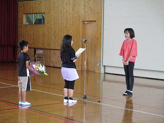 今日の業間に市非常勤事務職員の齋藤典子先生の離任式を行いました。齋藤先生は家庭の都合で8月いっぱいで退職されることになりました。齋藤先生は、印刷や使送、会計、清掃など、いろいろな仕事をして加園小を支えてくれました。一つ一つの仕事をしっかりやってくださるので本当に助かりました。離任式の児童代表お別れの言葉にも感謝の気持ちがあふれていました。また、時間ができたら学校の方にも遊びにきてほしいと思います。