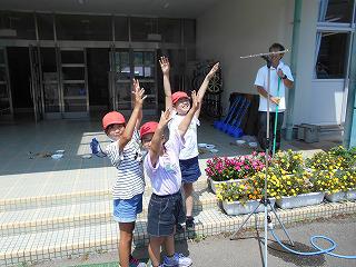 暑さ対策としてミストシャワーを購入し、昇降口に設置しました。出入りするときにミストがかかり、涼しそうでした。今日は、業間も昼休みも外遊びができました。まだまだ気温の高い日が続きそうですが、暑さに負けず元気に過ごしてほしいと思います。