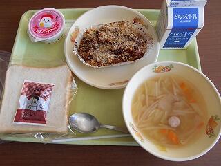 今日の給食は「食パン、マカロニミートグラタン、野菜スープ、豆乳パンナコッタ」でした。マカロニミートグラタンが出るのは今年度初めてでした。表面のカリッと焦げ目がついたところもおいしかったです。