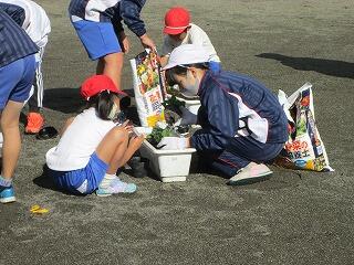 なかよし班で、プランターにパンジーを植えました。これは、児童の手で育てた草花を昇降口や卒業式の花道に飾るためのものです。自分たちの育てているプランターがどこにディスプレイされているか児童もわかっていて、登校してきたときや、休み時間に世話をしている姿をよく見かけます。今回も6年生が中心となって準備からプランターに定植するまでの活動を下学年に教えながらおこないました。たくさんの美しい花が育つようみんなで大切に育てたいですね。