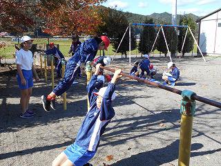 今日から業間に体力づくりを目的としたチャレンジタイムが始まりました。全校生がなかよし班ごとに、体操、一輪車、タイヤ、登り棒、うんてい、鉄棒、竹馬、まと当ての8つのコースを回ります。寒くなってきたので、かぜをひかないようにしっかり体力づくりに励んでほしいと思います。