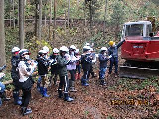 5年生の総合的な学習の一環で、下久我伐採現場、鹿沼市森林組合、栃毛工業株式会社を見学してきました。下久我伐採現場では、育った木をどのようにして伐採しているかを見学しました。目の前で木が切り倒されるのを見て、思わず歓声が上がりました。様々な機械を使って一定の長さにして運び出す工程を見せていただきました。次に森林組合で、山から切り出された木がどのように販売されているかを見学しました。太さごとに分けられる機械に感動しました。最後に、栃毛工業へ行き丸太がどのようにして製品になるのかを見学しました。機械の大きな音にも驚きましたが、丸太の皮をむく機械や丸太を柱にカットする機械を見せていただき、驚いていました。どの見学場所へ行っても、『鹿沼の木材は全国から買いに来る人がいるくらい素晴らしい品質』と言う話を聞いて、そんな鹿沼に住んでいることを誇りに思いました。