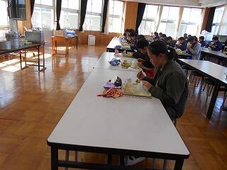 家庭科の時間には、感謝の気持ちを表す小物の制作を行っています。みんな真剣に取り組んでいます。何ができあがるのでしょう。