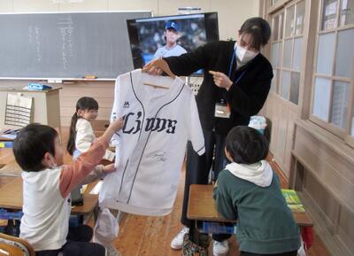 先日、地域の方のご協力により、本校卒業生の西武ライオンズ今井達也投手のサイン入りユニフォームが子どもたちにプレゼントされました。今朝、校長より今井投手の話をした後、各教室で今井投手のユニフォームを見たり触ったりしました。