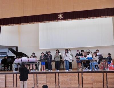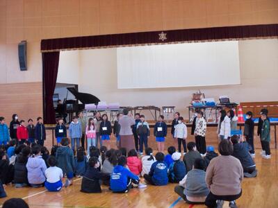 ミュージッククラブは、本校のクラブの時間に活動しています。今日は、1年間の取組の発表会を行いました。ここ数日、給食の時間に放送でお知らせした効果もあり、業間の体育館には、たくさんの児童が集まりました。