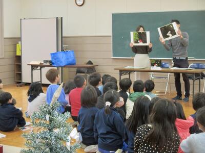 水曜日の今日は、いつもより長い業間です。この時間に、「北光コミスク・ねっと」主催の「クリスマスおはなし会」が開かれました。事前予約した児童が、ふれあい室に集まりました。