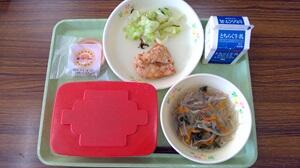 ☆お魚ランチ;ご飯・牛乳・鯵の一夜干し・切り干し大根の胡麻ドレッシング和え・鶏ごぼう汁