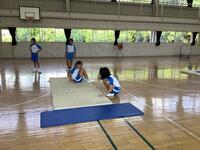マット運動では、各自で技を組み合わせた演技を考えています。
