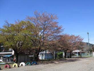 昨日は気温も低く、風雨の強い日でした。今日も肌寒さはありましたが、晴天となったので、校庭に出て桜とビオトープの様子を見てみました。ソメイヨシノはだいぶ花が散ってしまいました。一方、滑り台の奥にある枝垂れ桜は満開を迎えているようです。