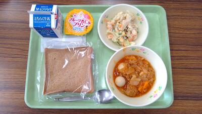 ☆黒食パン、牛乳、肉団子のケチャップ煮、ツナコーンサラダ、杏仁プリン☆