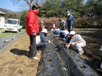 青空の元、じゃがいもを植えました。6年生がいない中、5年生と3年生が中心となって作業を行いました。新しい永野小ファミリーの船出を祝って、おいしいじゃがいもがたくさんとれることを祈ります。