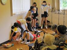 入所者の皆さんが会場に集まったあと、各クラスの出し物を披露しました。劇あり、歌あり、合奏ありのバラエティーに富んだ楽しい内容で、下の写真から雰囲気が伝わると思いますが、入所者の皆さんも楽しんでくれていました。劇の話の内容や演奏した曲名等はお子さんにお聞きください。その中でも、特に「ふるさと」の合唱では、入所者の皆さんの中にも歌っている方がおり、歌のもっている力のすごさやすばらしさを感じました。