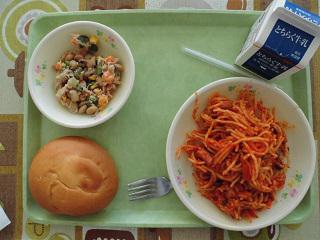 ☆減量はちみつパン、スパゲティナポリタン、ツナと大豆のサラダ、牛乳☆