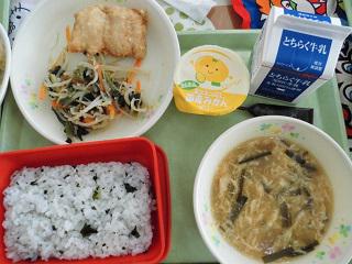 ☆わかめごはん、かきたま汁、鶏肉のから揚げ、ナムル、みかんゼリー、牛乳、ミルメーク☆