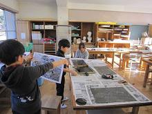 以前にもお知らせしましたが、11月26日から4週間にわたって川上澄生美術館の先生のご指導で5,6年生が版画の作成に取り組みました。今日はその最終日、全員がこれまで一生懸命に彫刻刀で彫った絵を刷りました。版木に黒インクを塗り、紙を版木に慎重にのせ、ばれんで一生懸命擦りました。紙を版木からゆっくりとはがし、紙が版木から離れた瞬間の子どもたちは、何とも言えない良い表情でした。これまでの彫刻刀での彫りをがんばったことで満足感や達成感を感じたことでしょう。どの児童の作品も美術館の先生や担任の先生の的確なアドバイスで素晴らしい作品になりました。