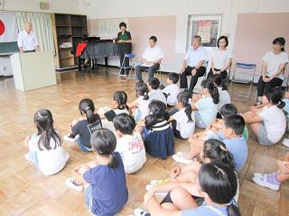 今日の終業式では、代表者が1学期の反省と夏休み、2学期の目標について、原稿を見ることなく堂々と発表しました。私からはいつものように「言霊(ことだま)」とお家の人への感謝について話しました。感謝を表すために休み中はお家の人の喜ぶことをやってくださいとお願いしました。(原稿を見ながらでした。)その後、柔道の表彰伝達、夏休みの生活の話をしました。いつも感心しますが、本校児童は体育座りできちんと話を聞く姿がとても素晴らしいです。素直さが態度に表れているようです。きっと話も心にすうっと入っていくことでしょう。