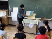 机の上にかわいいかえるくんとがまくんの人形があり、あたたかい雰囲気の中、子ども達はお話をよく聞いていました。