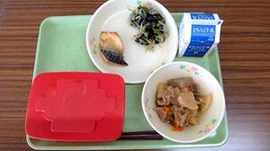 ☆お魚ランチ;ご飯・牛乳・鯖の塩焼き・海苔和え・大根と豚肉の煮込み
