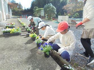 校舎前の花壇にはビオラを、校庭の花壇にはチューリップの球根を植えました。ビオラはすでにきれいに咲いていますが、来春まで美しい花を保ち続けてくれるでしょう。チューリップの球根は冬を乗り越え、春を待って美しい花を咲かせてくれるでしょう。そして、2年ぶりの入学式に文字通り花を添えてくれることになるでしょう。