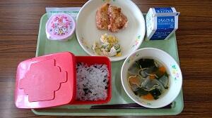 ☆入学お祝い献立;わかめご飯・牛乳・鶏肉のからあげ・コールスロー・すまし汁・お祝いゼリー