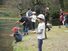 あいさつをしてから、初めにフィッシング体験です。フィッシングパークの皆様にえさの付け方やさおのもちかたなどを指導していただき、フィッシングに挑戦しました。子どもたちは見よう見まねでしたが、だんだん慣れてきて、たくさんの魚を釣ることができ満足していたようでした。魚がかかったときの手の感覚はいつまでも忘れられないことでしょう。