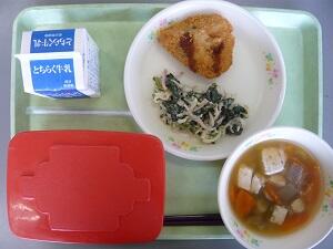 ☆旬のお魚ランチ:ご飯 鰤フライ 切り干し大根の胡麻マヨネーズ和え 鶏ごぼう汁 牛乳