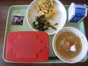 ☆セルフかき揚げ丼(ご飯)・牛乳・野菜かき揚げ・おかか和え・豚汁・たれ
