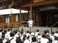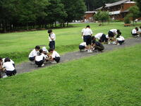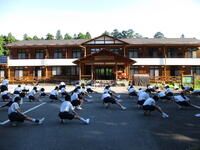 自然体験学習の2日目の朝は、6時30分から行われる「朝の集い」からスタートです。朝食前に、玄関前に集合しラジオ体操と今日の予定を確認しました。眠い目を擦りながらも、朝からしっかり体を動かして、解散するころにはすっかり目が覚めた様子です。