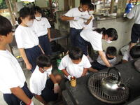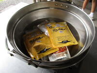 その後、その火を使って「やかんならし」をしました。やかんでお湯を沸かして、お茶会をする予定でしたが、お茶会の時間を十分に取ることができませんでした。その火を使って、飯ごうでご飯をたき、そして、自分たちで用意した、牛丼や親子丼、カレーのレトルトパックを温めて、ご飯にかけて食べました。どの班のご飯が上手に炊けました。また、自分たちでおこした火をランタンの火に取っておき、カレー作りや杉板焼きに使うなど、3日間利用します。