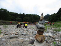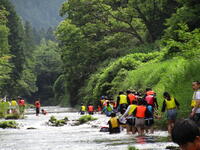 お昼の後は、川遊びと仲間づくりに分かれる予定でしたが、明日の天候不良等が心配されるため、全クラスでの川遊びに変更となりました。