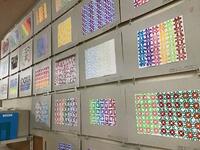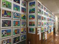 美術室前の廊下に、色鮮やかな作品が並びました。