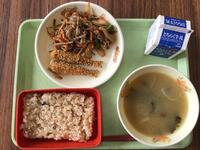 【五目ごはん、牛乳、いわしのカリカリフライ、五目きんぴら、なめこの味噌汁】