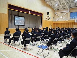 本日、3月24日(木) 各教室でオンラインによる修了式を行いました。校長先生のお話と1年生、2年生の作文発表がありました。修了式前には表彰式を行い、その様子は、オンラインで中継されました。式終了後、生徒会長からウクライナへの支援募金額が発表されました。今回も密を避けながらの実施となりました。