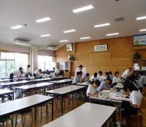 1学期の期末テストは、6月26日(水)~27日(木)です! そこで、今日からテスト日までの2週間を学習相談期間とし、昼休みに食堂を自主学習の場所として提供しています。昨年までは学年ごとに別室で学習相談を行っていましたが、今年度は全学年を同室とし、3年生等にミニティーチャーの役割を果たしてもらって、互いに教え合う、学び合うという試みを開始しました。