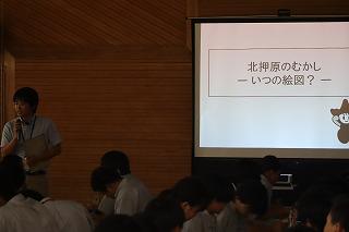 1年生は現在、「総合的な学習の時間」において、ふるさと鹿沼についての探究学習をしています。その一環として本日は、鹿沼市教育委員会文化課の堀野周平氏ら2名の方を講師としてお招きし、「もっと知ろう~北押原の歴史と地名を探る~」と題した出前講座を実施しました。