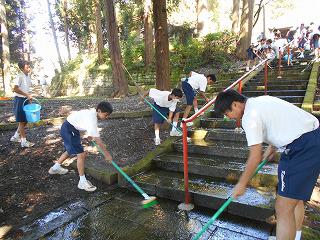 本年度は9月15日(日)に行われ、全校生の1/3にあたる約100名の生徒がボランティアとして参加し、境内階段の清掃、除草、落ち葉拾い、ゴミ拾いなどに一生懸命に取り組みました。