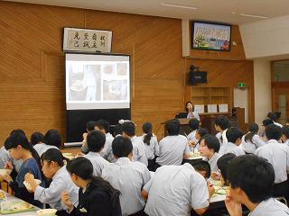 給食の時間においては、本校の給食残量と市全体の残量を比較するなど実態に即して、給食の大切さを全校生にお話いただきました。