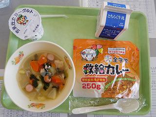 10月9日(水)の給食は、「防災救食」が実施され、地震や水害などで避難所生活になったときに食べる非常食を体験しました。これは、被災時の不便さや日常生活へのありがたみを学び、万一の時の非常食に対する抵抗を軽減する等の目的で、市内の全小中学校で実施されているところです。献立は、「非常食カレー(救食カレー)」がメインで、ポトフ、ヨーグルトもいただきました。ぜひ、ご家庭でも生徒から感想を聞いてみてください。