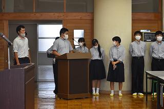 10月7日(水)の帰りの会終了後、生徒会新旧役員交代式を行いました。感染症拡大防止対策のため、進行係の生徒以外は参加せず、新旧生徒会役員の生徒のみで行いました。