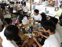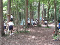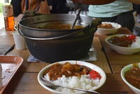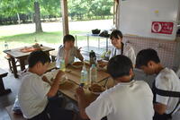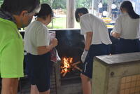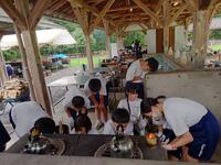 朝食の後は、野外炊飯です。カレーを作ります。かまどの火は、前日に起こした火を利用しました。食材を切ったり、ご飯の火加減を確認したり、班のメンバーで協力して美味しいカレーができました!