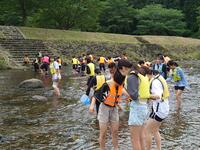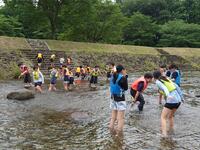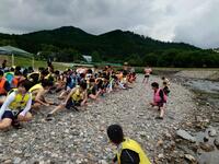 お昼の後は、川遊びと仲間づくりに分かれる予定でしたが、明日の天候不良等が心配されるため、全クラスでの川遊びに変更となりました。