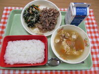 7月18日【木曜日】《さつきランチ》ご飯、牛乳、モロスタミナ焼き、ニラとかんぴょうの味噌汁、ナムル、とちおとめゼリー