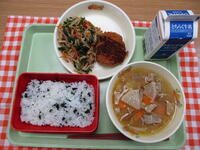 7月11日【木曜日】わかめご飯、牛乳、メンチカツ、おかか和え、豚汁
